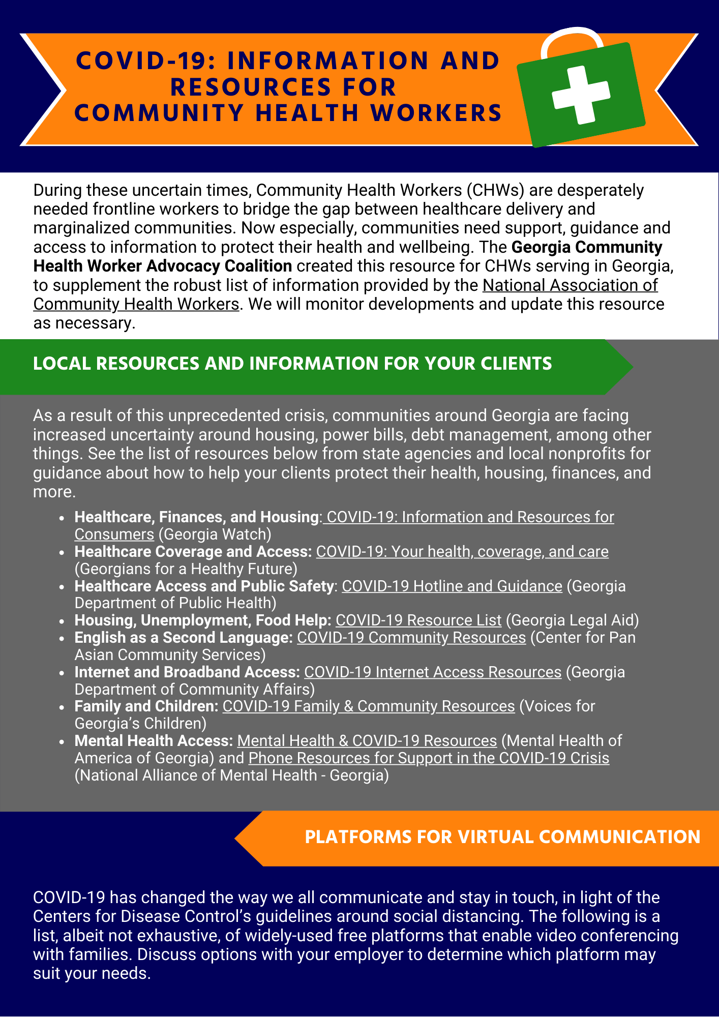 COVID-19, Vaccines, and CHWs: A Conversation with Georgia CEAL. Hosted by the Georgia Community Engagement Alliance (Georgia CEAL) and the Community Health Worker Advocacy Coalition, the first conversation occurred on December 7, 2020, 3pm – 4:30pm and discussed a new initiative on COVID-19 vaccines and vaccine trials in Georgia. The conversation provided a forum where related questions and concerns of particular interest to CHWs (including issues of mis/trust and more) could be addressed. Stay tuned for details about follow-up conversations.