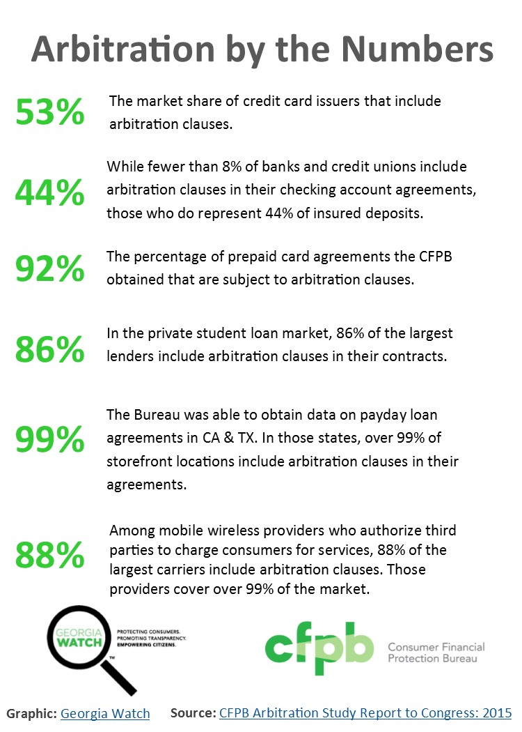 | Arbitration | This graphic shows how mandatory arbitration impact consumers according to a 2015 study released by the CFPB | Mandatory Arbitration by the Numbers |